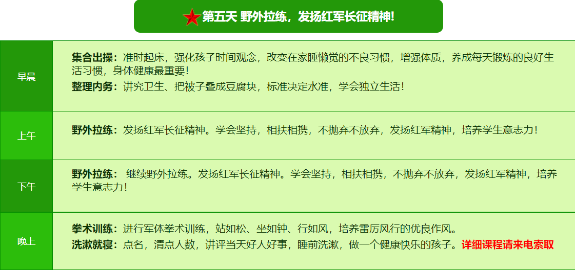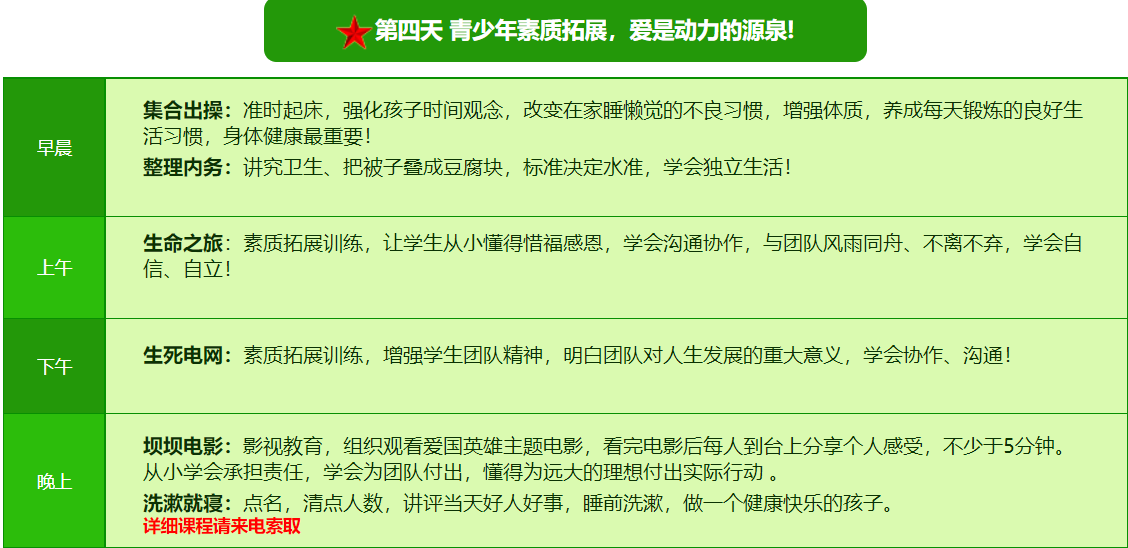 先进的特训理念:激发孩子改变和成长的核心问题是帮助孩子树立正确的人生观,价值观和学习观:让孩子明白真正学习目的,人生责任和追求目标、启发感恩之心,明白爱的真谛:树立积极心态和自信,创造自己生命的辉煌。